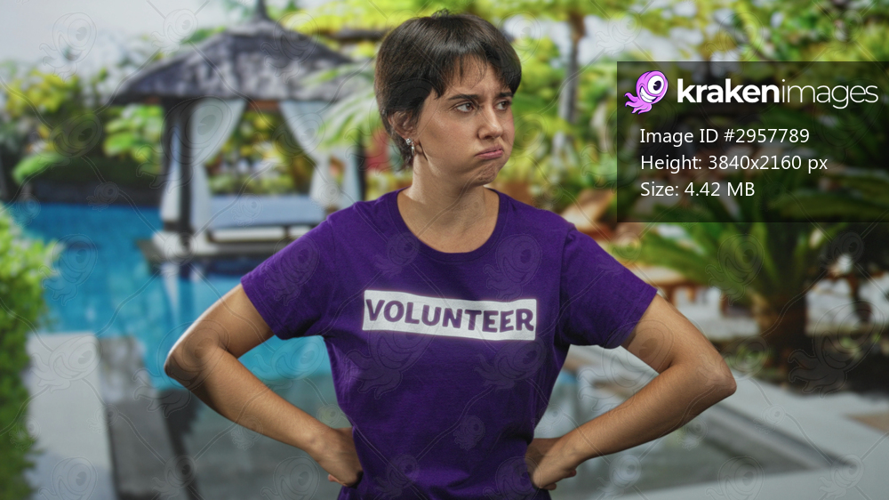 Volunteer woman wipes face with hand and squints eyes in a studio pool backdrop; frustration fatigue.