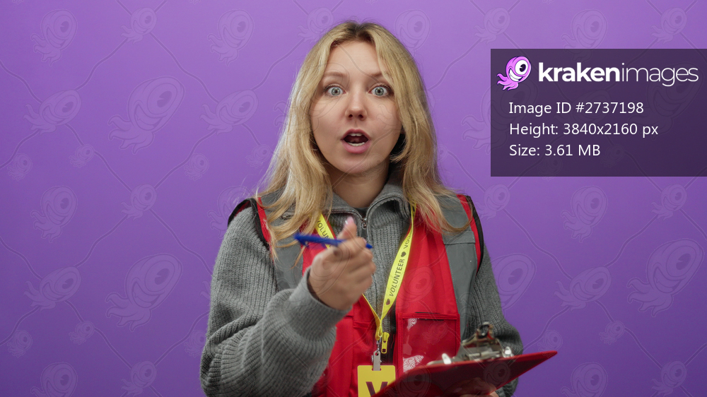 Volunteer woman writing notes on clipboard with purple background, dressed in red vest, emphasizing community service and engagement.