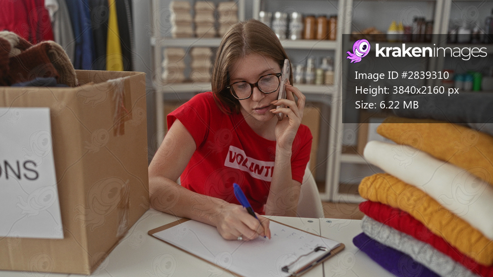Volunteer woman writing on clipboard and talking on phone inside building; charity compassion dedication.