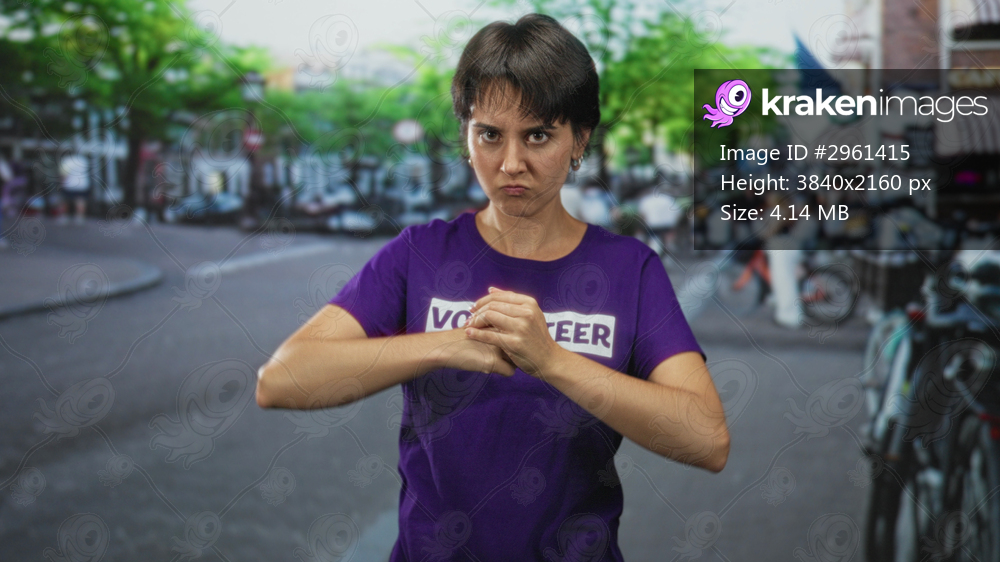 Volunteer woman, young with short hair, scowling while pressing fist to open palm beside parked bicycles on a busy street, wearing a purple volunteer t shirt; determination focus. - Kraken Images