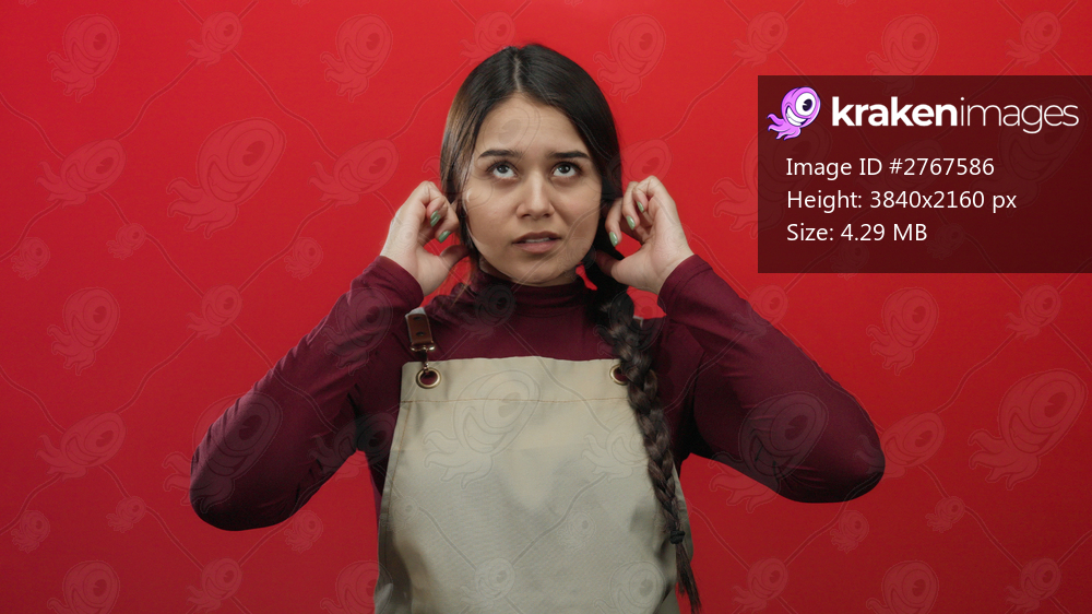 Waitress closing her ears with a focused expression against a vibrant red background, wearing a beige apron over a burgundy top.
