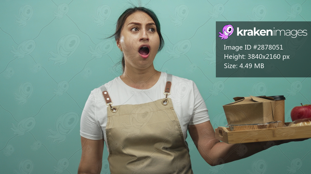 Waitress with tray of takeout, coffee cup and apple, hand to forehead in a mint green studio; surprise service mistake.