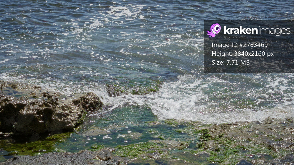 Waves crashing on rocky coastline with moss and sparkling blue mediterranean sea under sunny sky creating peaceful serene beach scenery