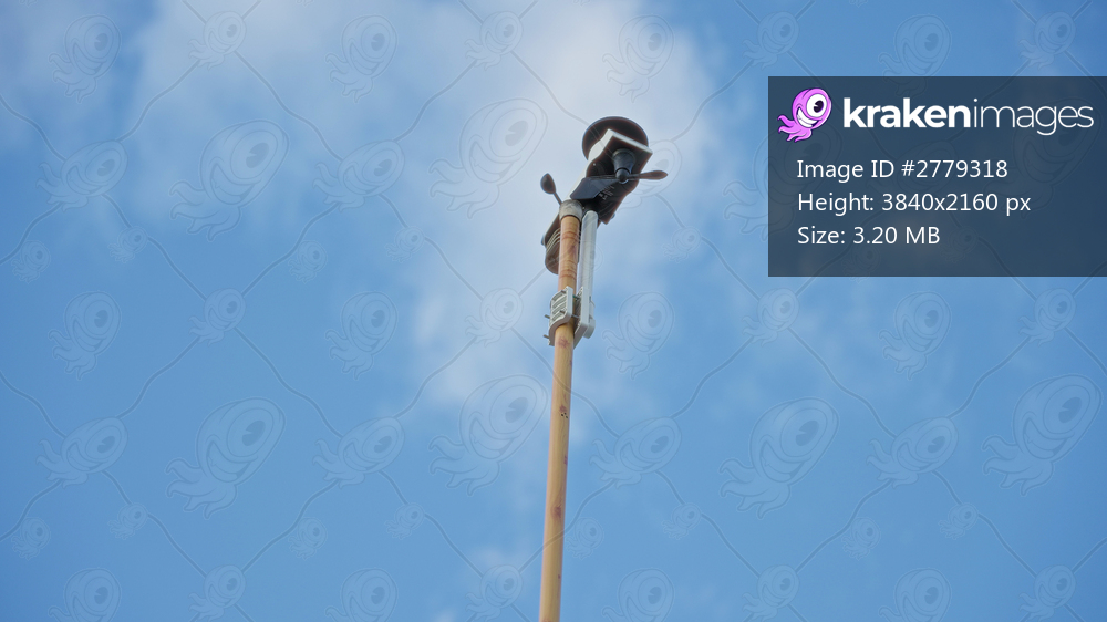 Weather instrument mounted high against the clear blue sky, capturing precise atmospheric data in a serene outdoor environment.