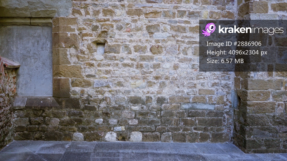 Weathered stone and mortar wall texture in sharp focus with visible brick joints and aged patina, outdoor background; background backplate copyspace calm. - Kraken Images