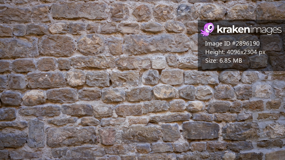 Weathered tan and gray stone brick wall texture, sharp focus, outdoor building facade with visible mortar joints and irregular stones; background backplate copyspace calm. - Kraken Images