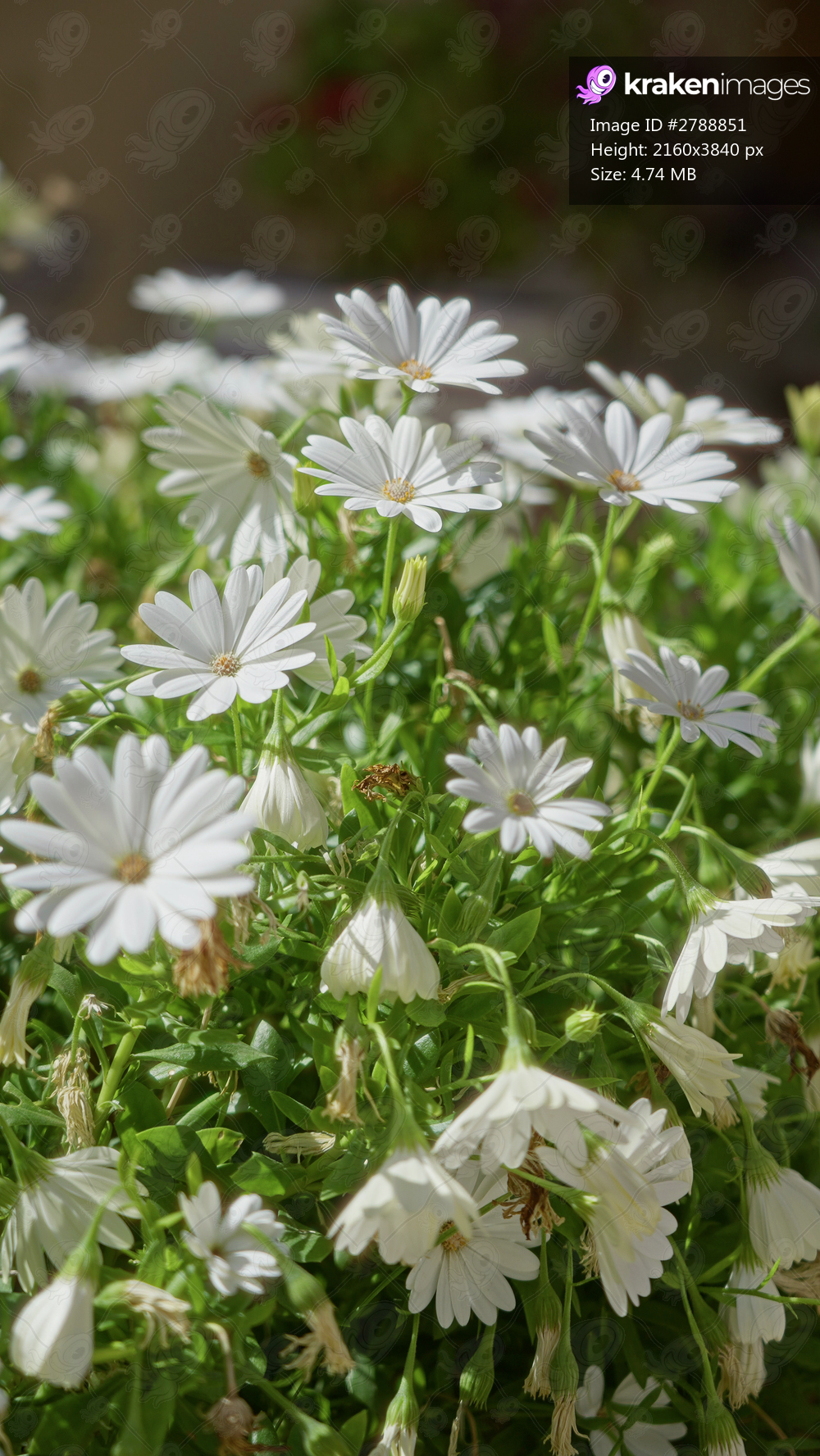 White daisies blooming under sunny skies in spain, showcasing vibrant green foliage and crisp white petals.
