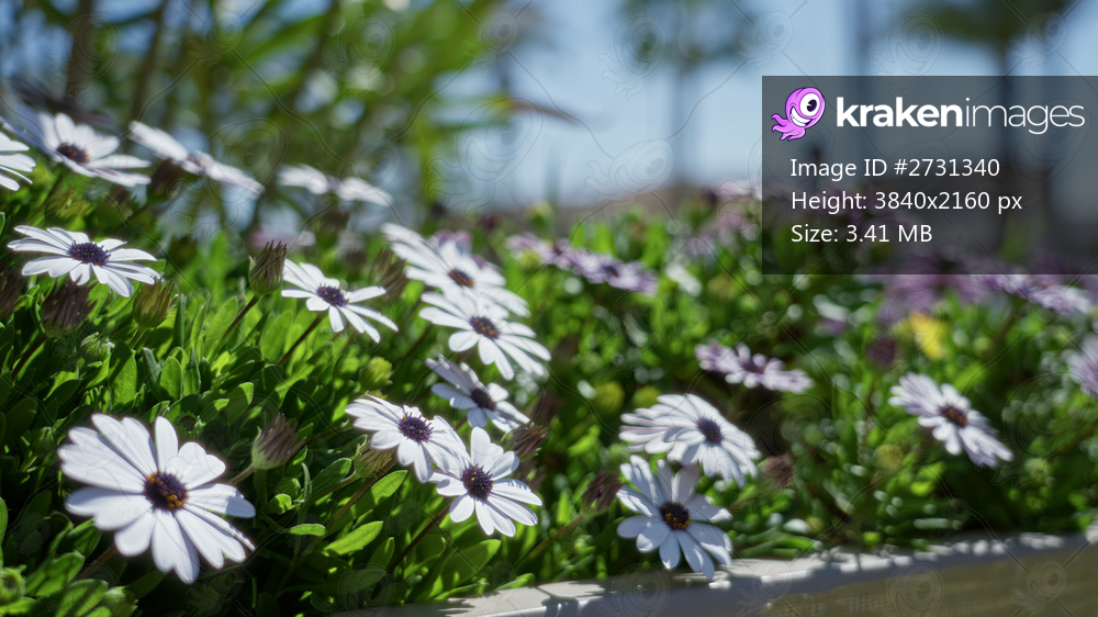 White daisies flourishing outdoors in sunny torrevieja setting with blurred palm trees enhancing the vibrant spring atmosphere in spain.