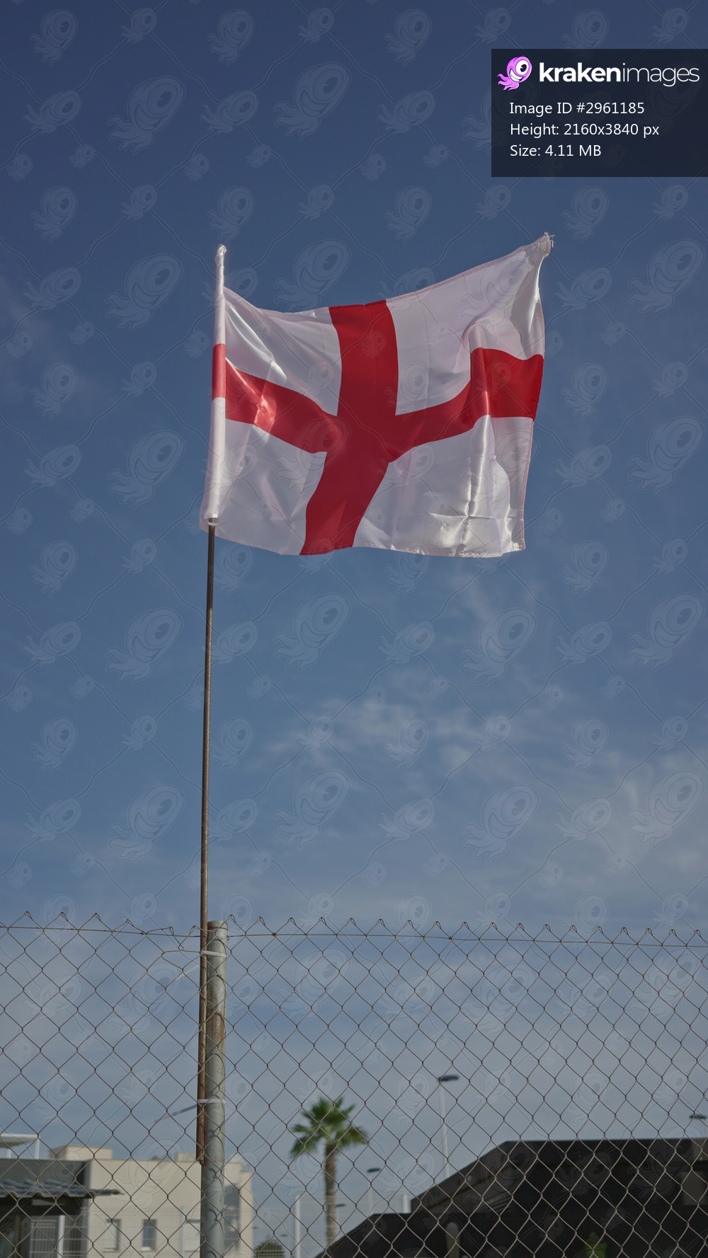 White flag with red cross waving on pole above chainlink fence beside building in daylight; patriotism serenity.
