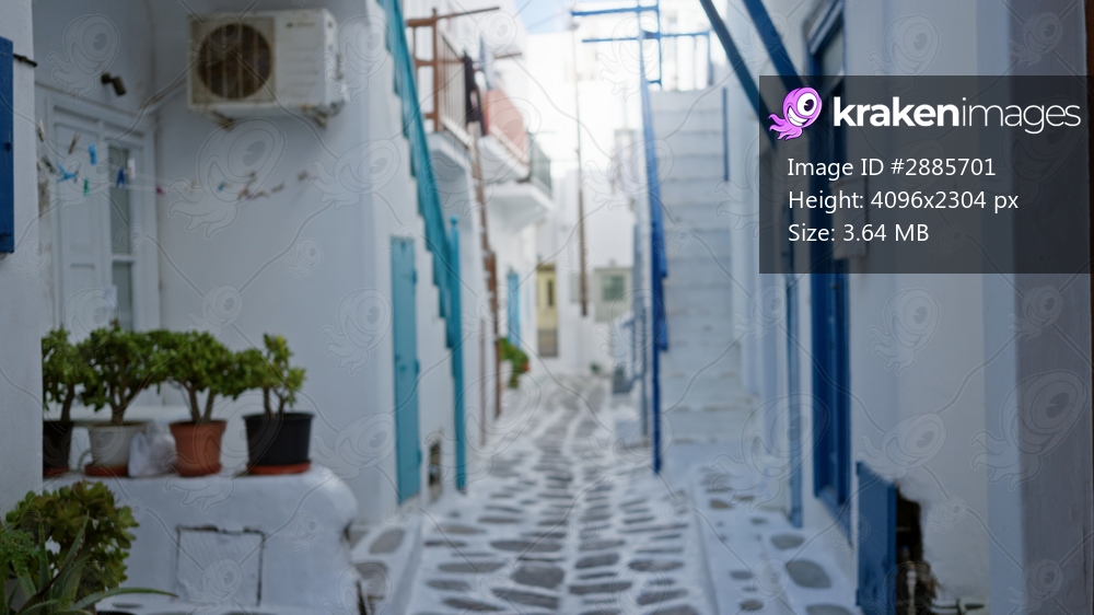 Whitewashed mediterranean alley softly defocused with shallow bokeh, showing narrow stone pavement, blue doors, white stairs and potted plants alley; background backdrop copyspace calm.