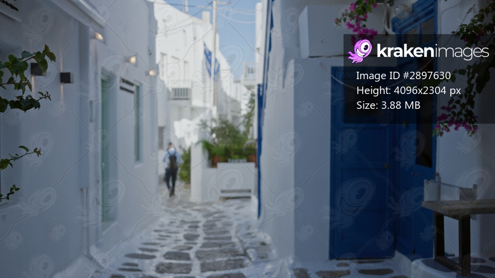 Whitewashed narrow mediterranean alley with blue door and stone paving, soft bokeh alley; background backdrop copyspace calm.