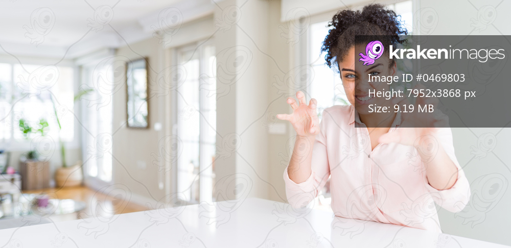 Wide angle of beautiful african american woman with afro hair smiling funny doing claw gesture as cat, aggressive and sexy expression