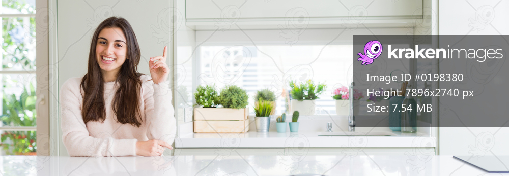 Wide angle picture of beautiful young woman sitting on white table at home with a big smile on face, pointing with hand and finger to the side looking at the camera. - Kraken Images