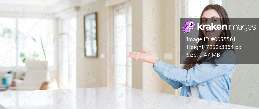 Wide angle picture of beautiful young woman sitting on white table at home Pointing to the side with hand and open palm, presenting ad smiling happy and confident - Kraken Images