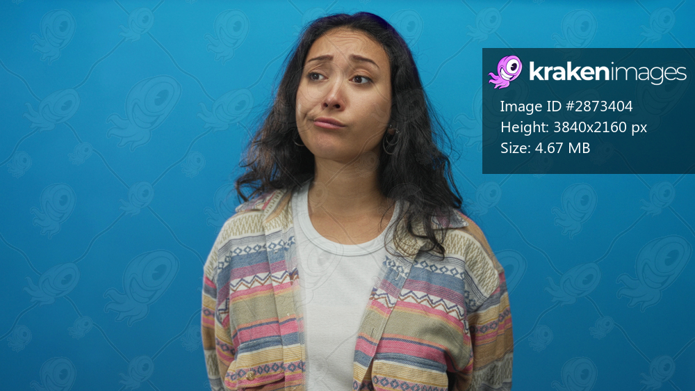 Woman with a frown and visible face in a blue studio, wearing a patterned cardigan over a white tshirt; quiet bemusement.