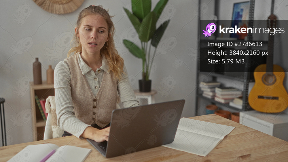 Woman with a laptop typing from home tilts her head behind blonde young locks while sitting at a desk in a modern interior remote workspace.