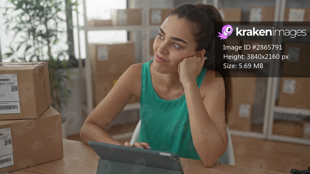 Woman with a stack of cardboard packages resting chin on hand beside tablet in building; contemplation.