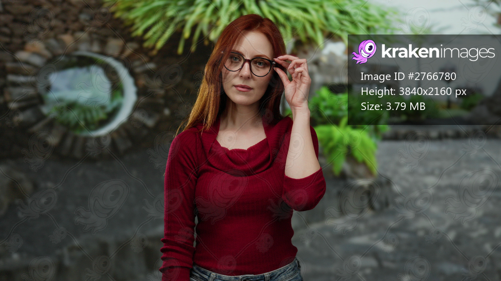 Woman adjusting glasses with green plants behind on a city street, showcasing her red hair and casual red sweater.