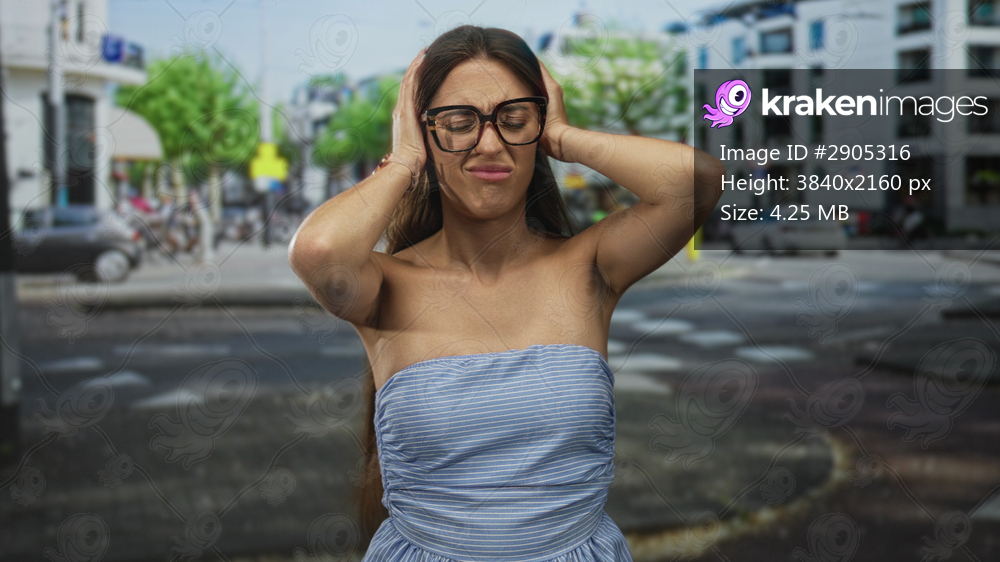Woman adjusting glasses with hands to head on urban busy street crosswalk near parked cars; contemplation.