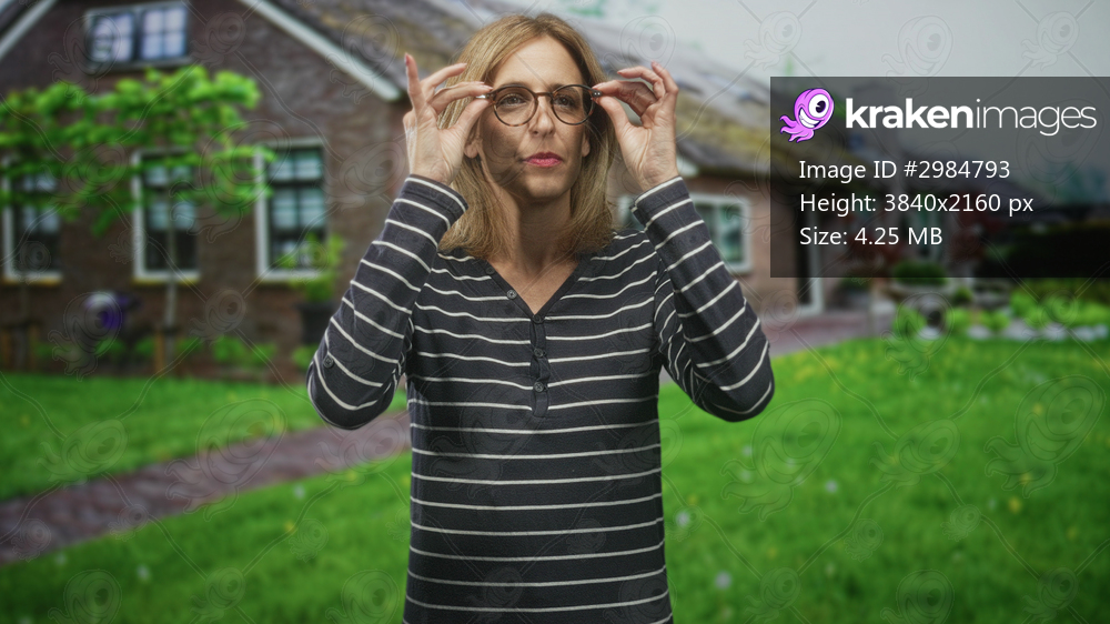 Woman adjusting glasses with hands, wearing striped top while standing on a lawn path in front of a brick building with windows; contemplation.