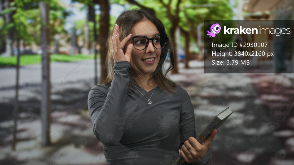 Woman adjusting glasses and holding book on sunlit tree lined street with heart necklace visible; curiosity learning.