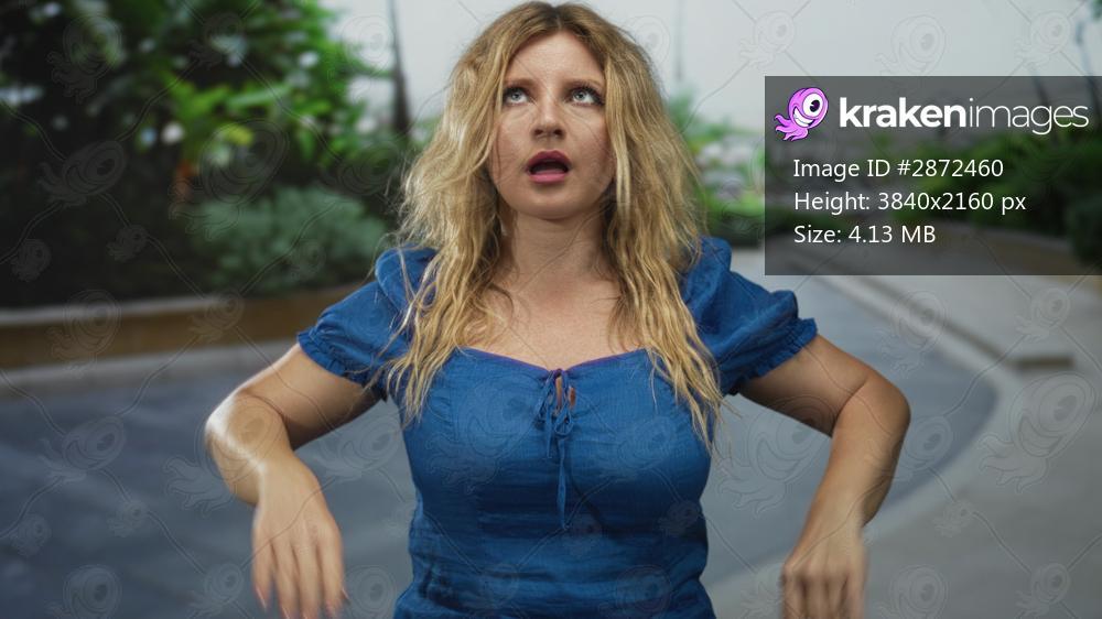 Woman adjusting hair with hands on hips on street near building and plants wearing blue dress looking upward; annoyance contemplation resolve.