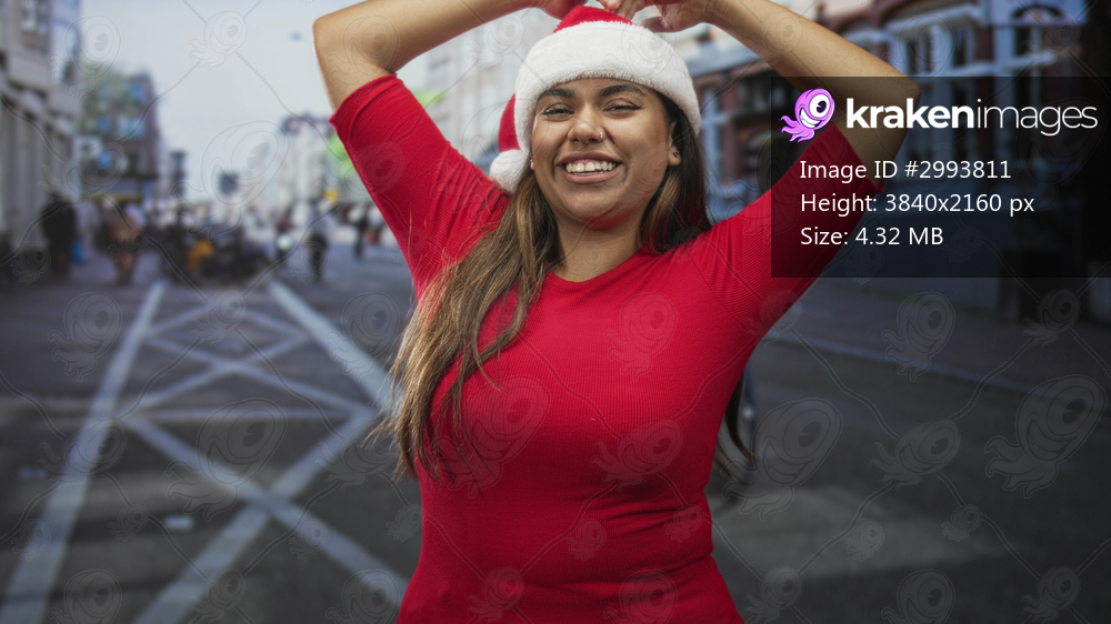 Woman adjusting santa hat with raised arms on street in front of building wearing red top; holiday joy.