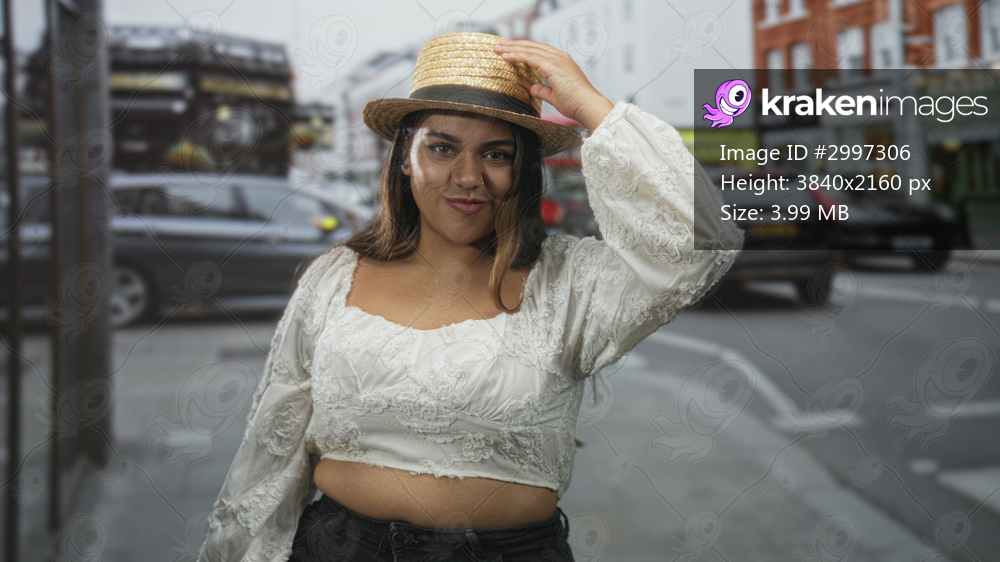 Woman adjusting straw hat with midriff visible while posing on a busy london street; playful confidence.