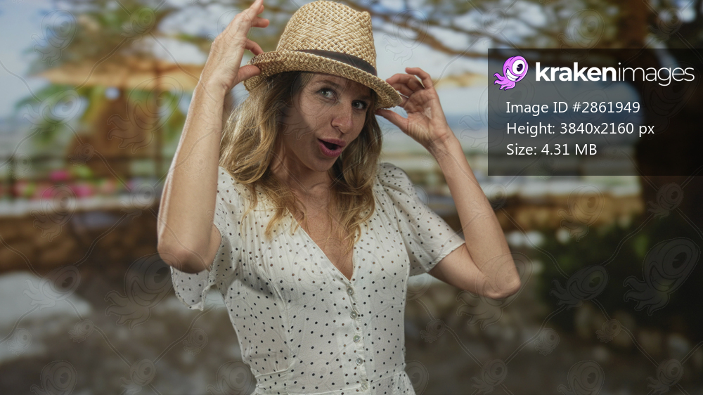 Woman adjusting straw hat and showing cleavage on restaurant terrace building while smiling at camera; carefree joy.