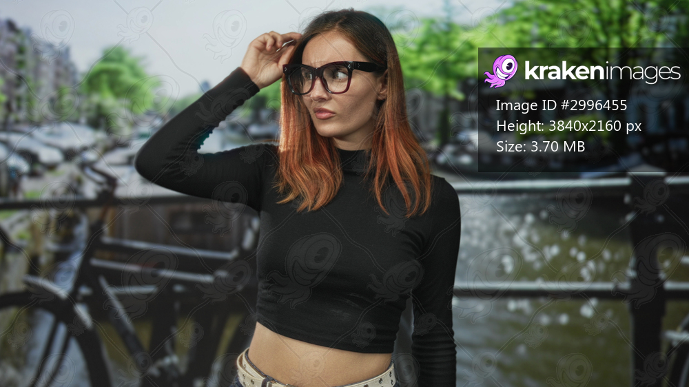 Woman adjusts black glasses with hand, exposing midriff and squinting gaze toward left in studio; quiet skepticism.