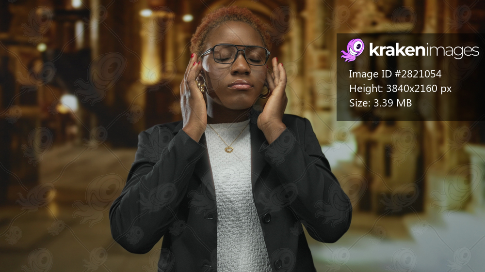 Woman adjusts glasses and closes eyes amid ornate stone pillars and stained glass windows in church interior; serenity.