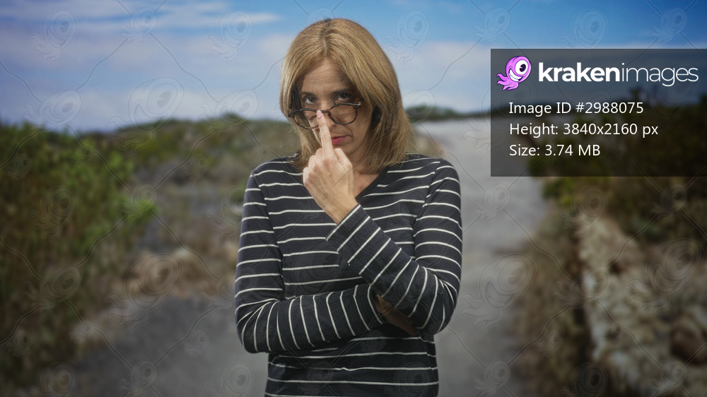 Woman adjusts glasses with finger to nose and stands with arms crossed on a coastal trail between shrubs and rocky path; annoyance reflection.