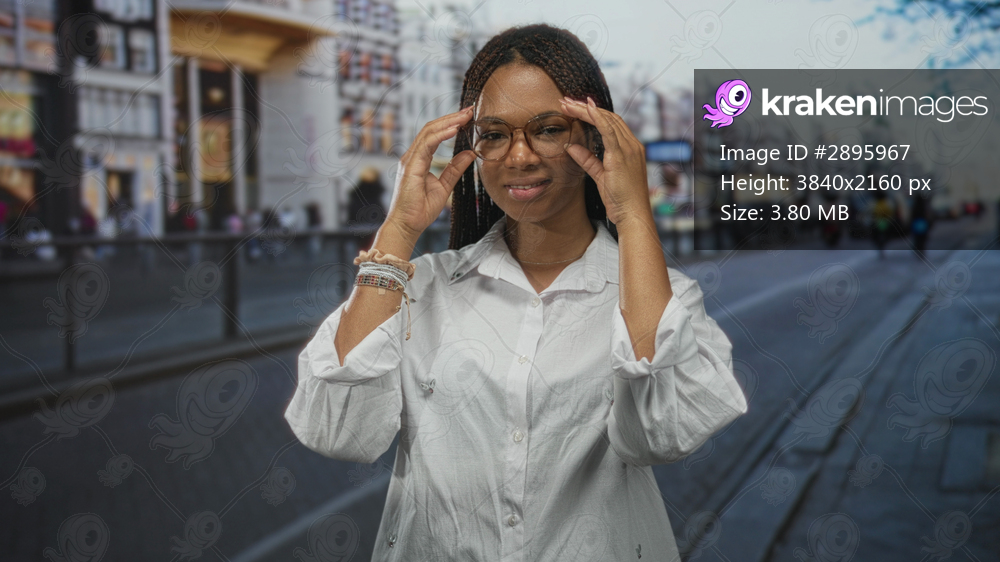 Woman adjusts glasses and gestures with hands while standing with crossed arms on a busy city street; confidence independence.