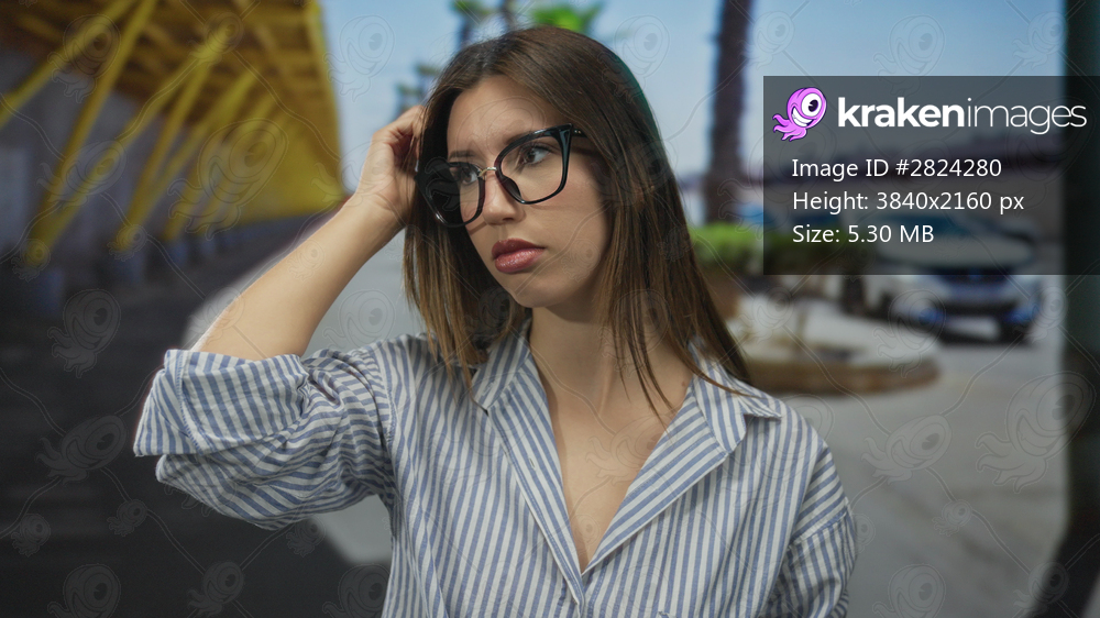 Woman adjusts glasses with hand on a sunlit street under yellow canopy by parked cars and palm trees; contemplation.