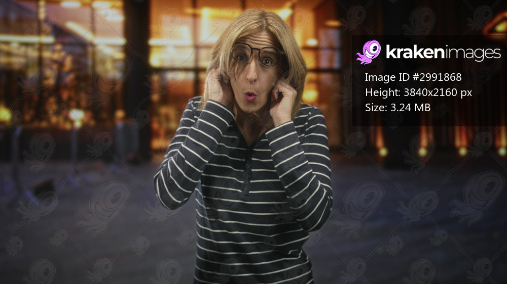 Woman adjusts glasses, hands pressed to ears, wearing striped sweater in building lobby near columns and lights; surprise playfulness.
