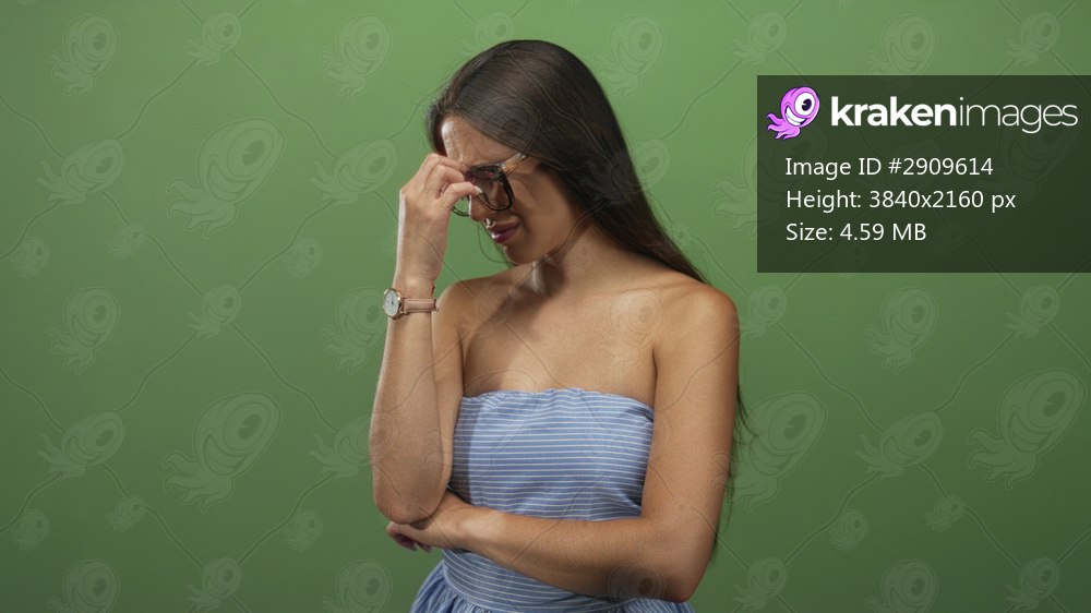Woman adjusts glasses with her right hand, pressing the bridge while standing in a green studio with crossed arms; pensive.