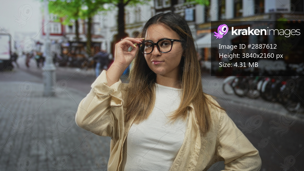 Woman adjusts glasses on a busy city street near bicycles and cafe terraces while holding the frame with her right hand; confidence curiosity.