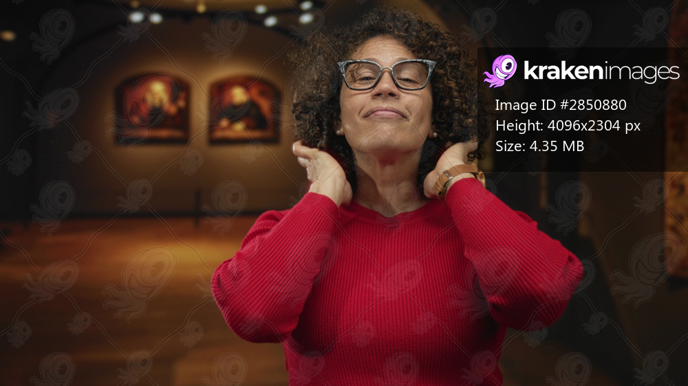 Woman adjusts glasses, touches hair and offers a slight smile while standing near framed paintings in gallery building under warm lights; quiet confidence. - Kraken Images