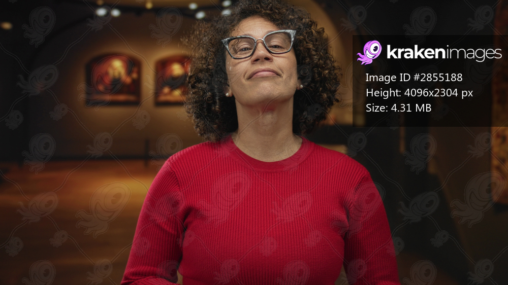Woman adjusts glasses, touches hair and offers a slight smile while standing near framed paintings in gallery building under warm lights; quiet confidence. - Kraken Images
