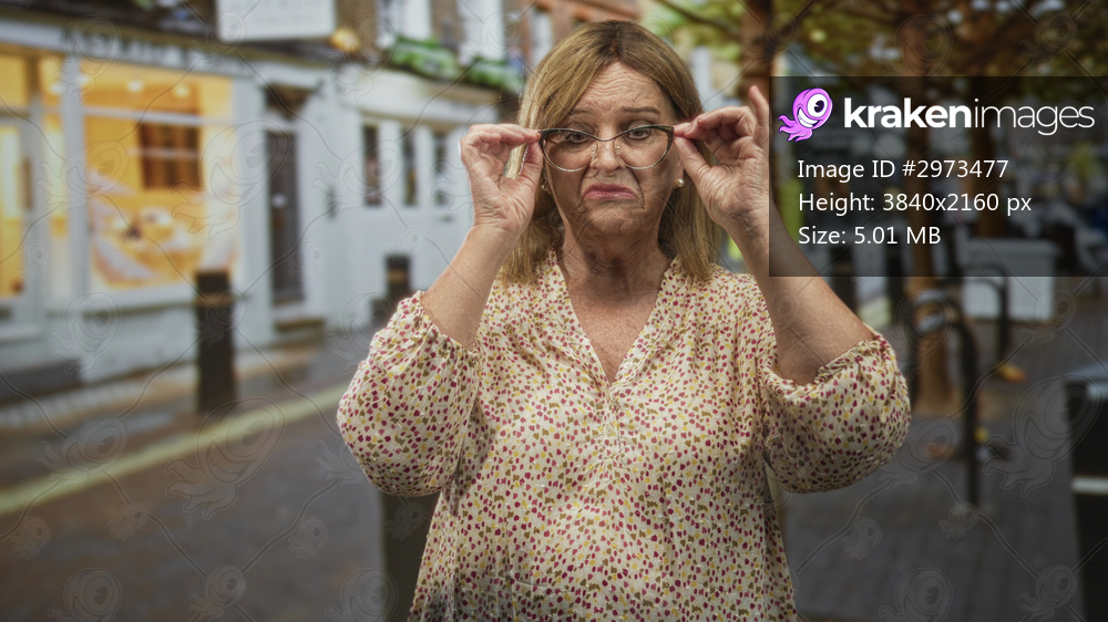 Woman adjusts glasses and tucks hair while grimacing, rubbing forehead and showing irritated frown on street; frustration daily life.