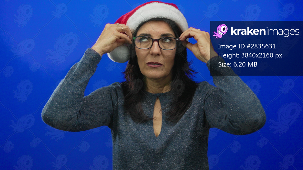 Woman adjusts glasses under santa hat in blue studio wearing sparkling sweater with both hands touching frames; stress.