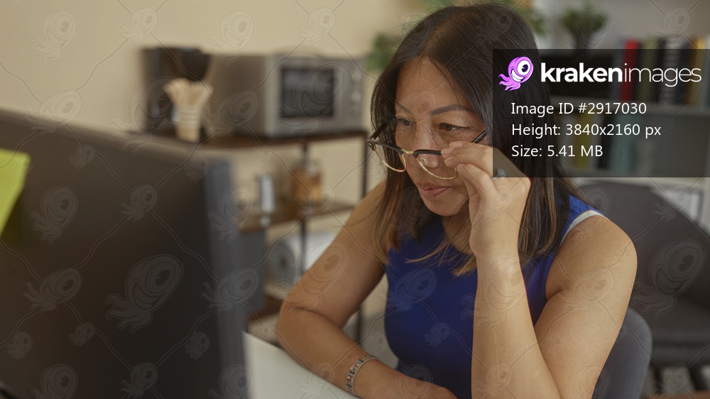 Woman adjusts glasses while examining a computer monitor at desk inside building office, hand near face and bookshelf visible; concentration productivity. - Kraken Images