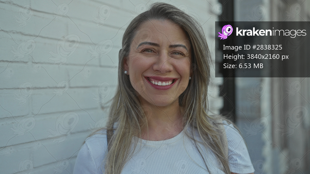 Woman adjusts hair against white brick building facade holding strands near face; subtle calm reflection.