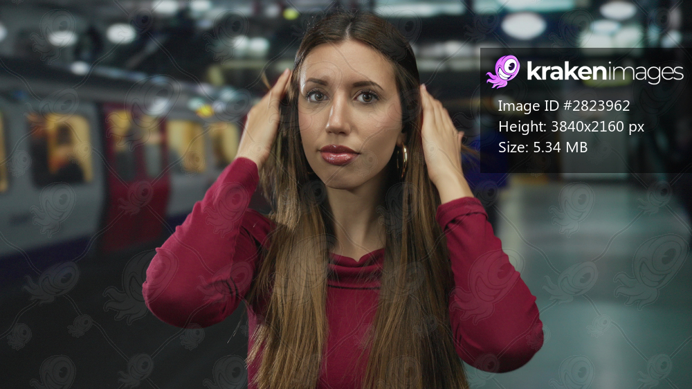 Woman adjusts hair behind her ears while standing on platform in a train station building; calmness.