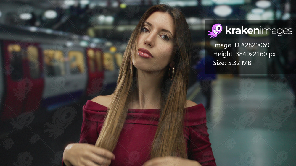 Woman adjusts hair behind her ears while standing on platform in a train station building; calmness.