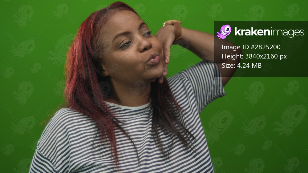 Woman adjusts hair with hand against vivid green backdrop in studio; calm contemplation.