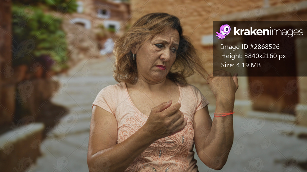 Woman adjusts hair with visible gesture on sunlit cobblestone street in old town; concern reflection.