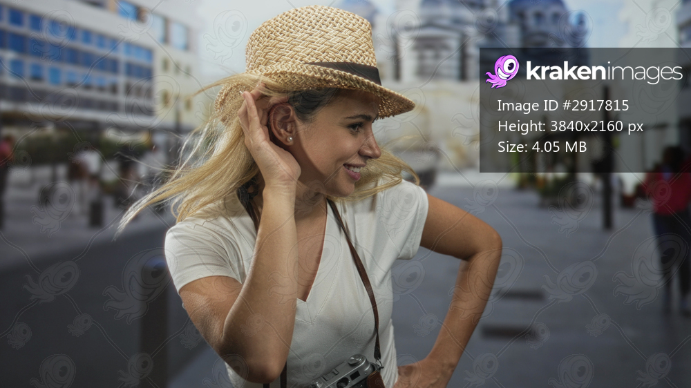 Woman adjusts straw hat and cups ear with hand while camera hangs at her neck on street; curiosity travel.