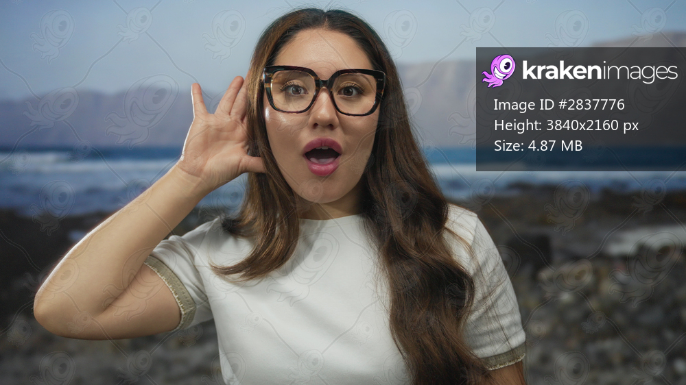 Woman adjusts tortoiseshell eyeglasses with hand to ear while gazing toward sunlit ocean waves on beach; listening inquiry attention curiosity.