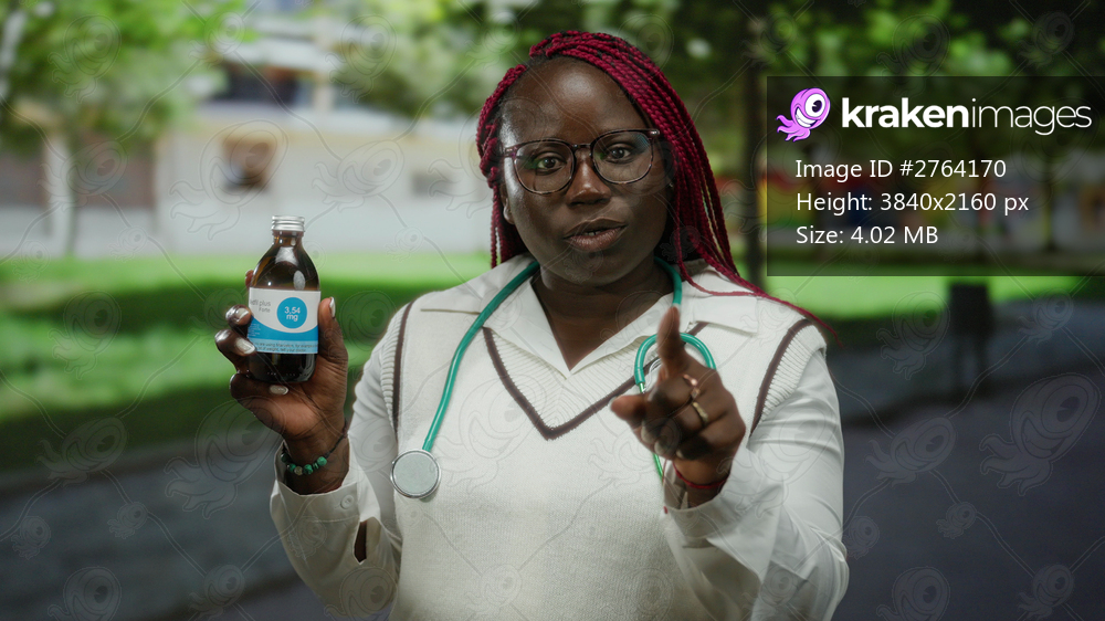 Woman african american doctor holding medicine bottle in a sunny park, wearing a stethoscope, and explaining medication details outdoors.